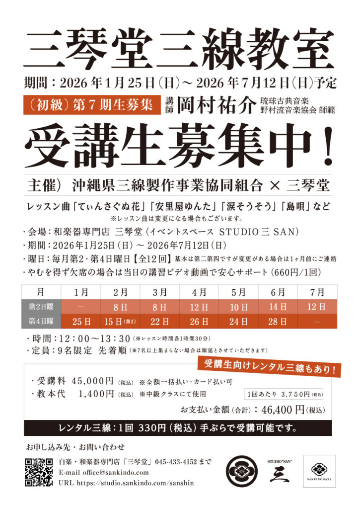 横浜・和楽器専門店三琴堂では、1月より「三線教室(初級)7期」を開講いたします!
