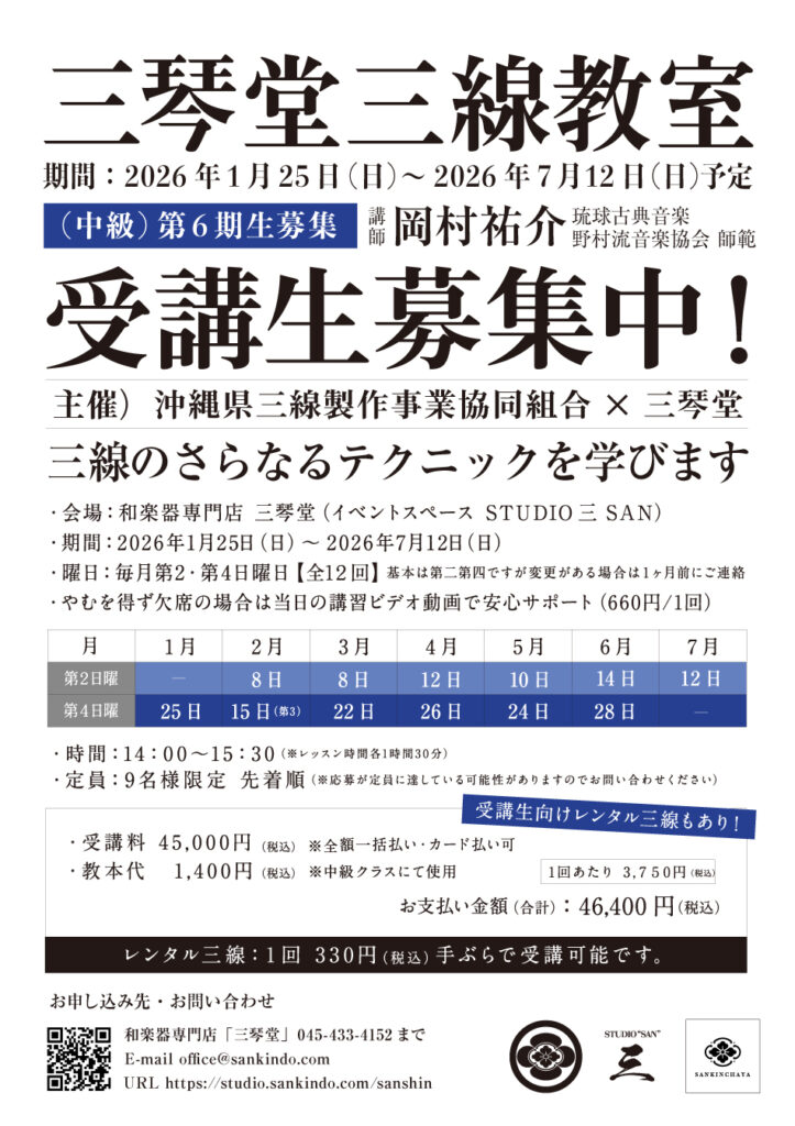 横浜・和楽器専門店三琴堂では、1月より「三線教室(中級)6期」を開講いたします!
