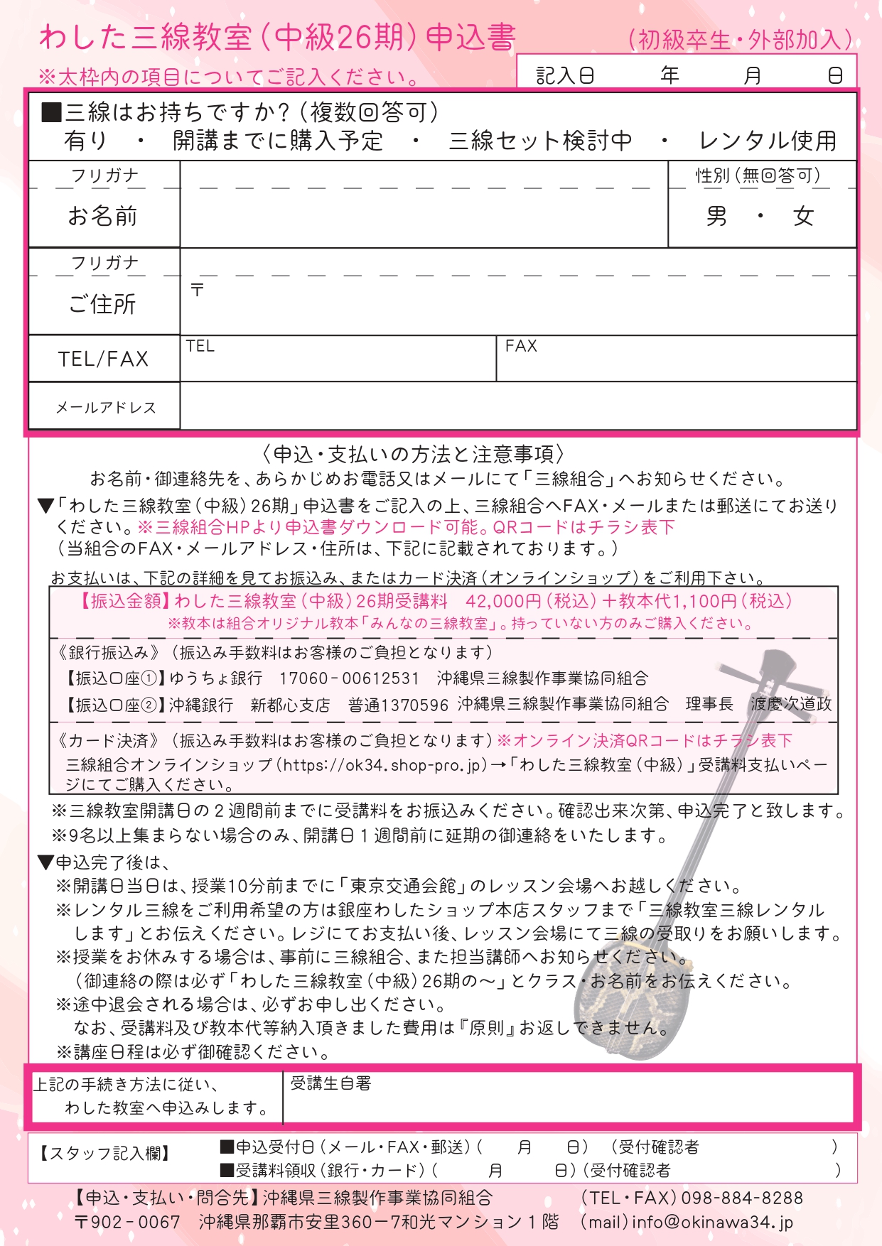 以下よりPDFのお申込書がダウンロード可能です。ご記入いただき、三線組合へメール(写メOK)またはFAXにてお送りください。