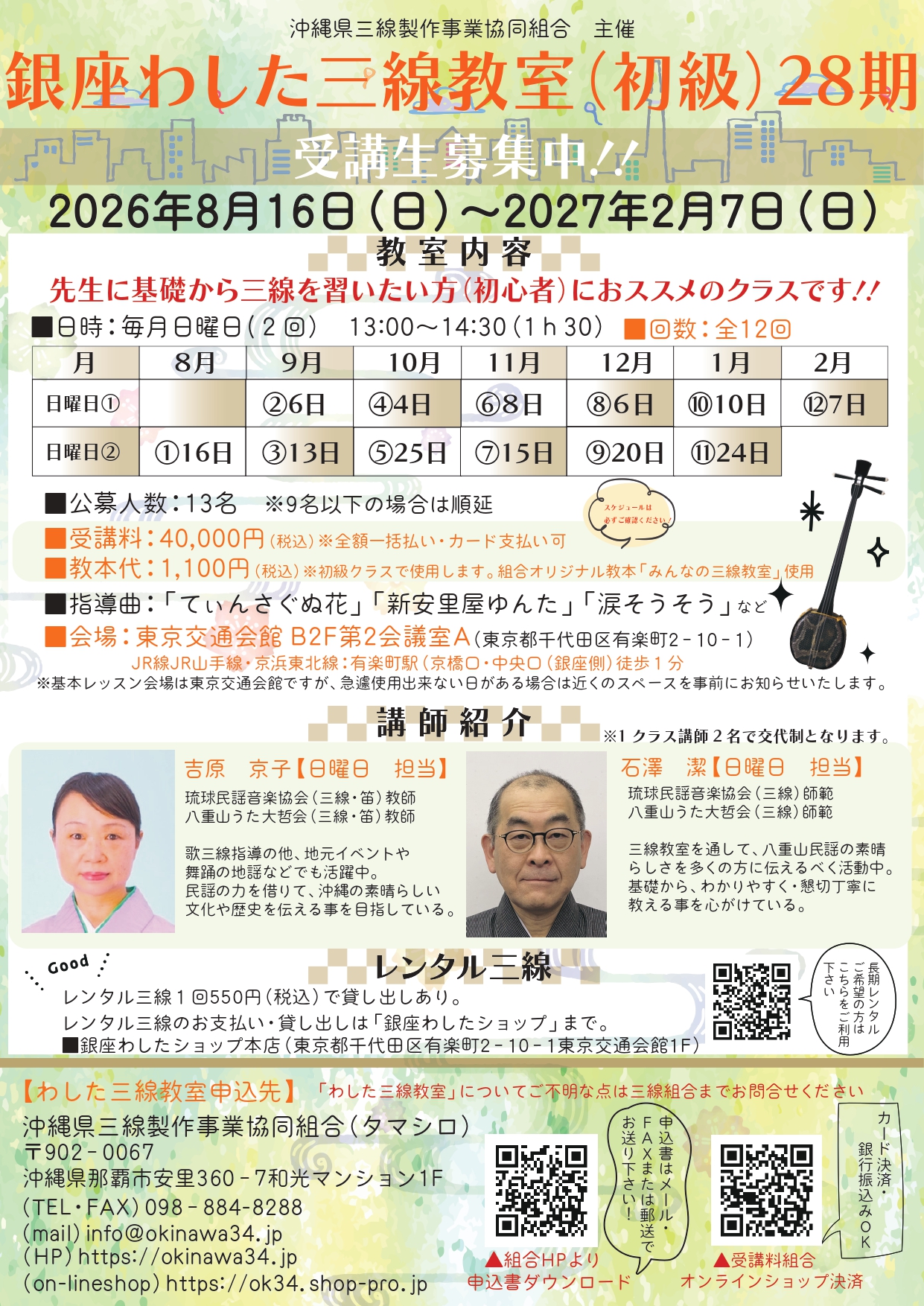 三線組合主催「銀座わした三線室(初級)28期」が2026年8月16日(日)13:00~14:30に開講いたします。
