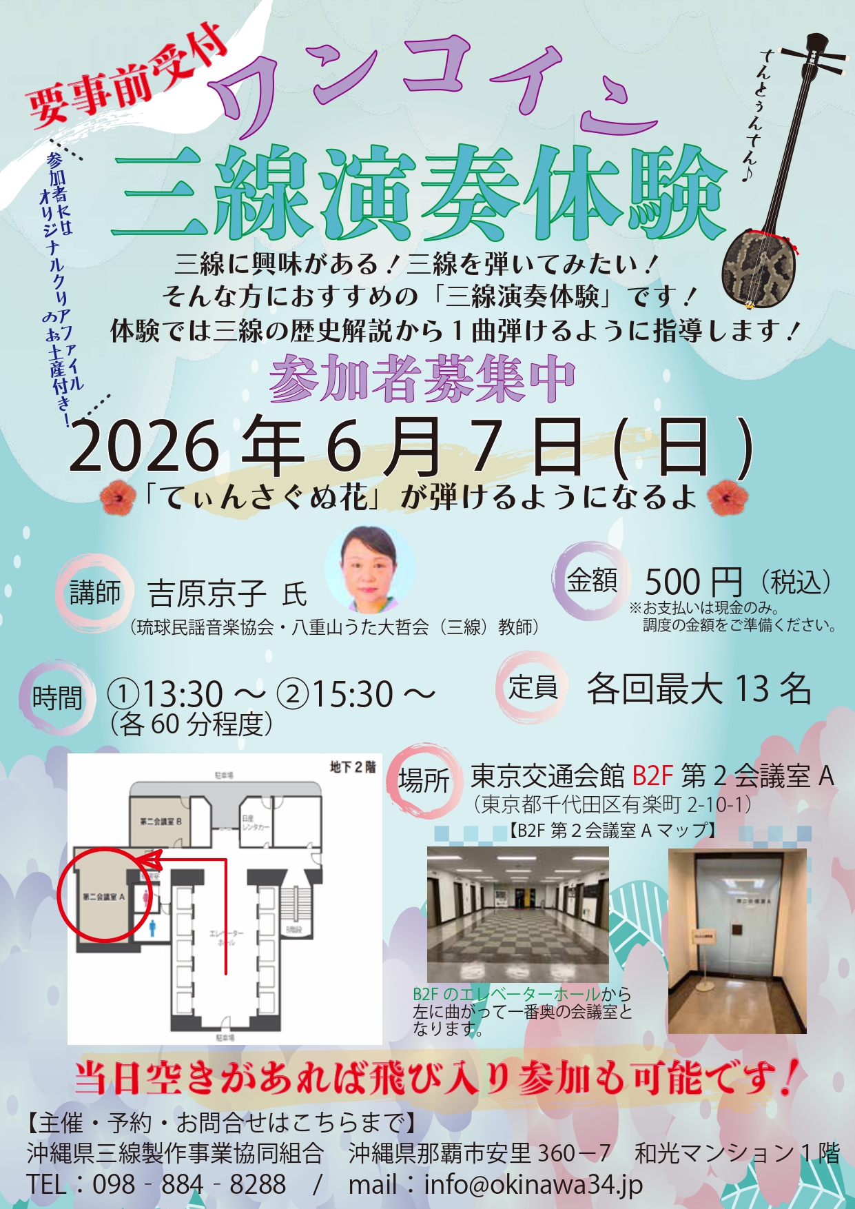 注) ワンコイン三線体験の会場は銀座わしたショップではなく、東京交通会館、地下2階第2会議室A(地下へはエレベーターでおおりください)となりますのでお気をつけください!